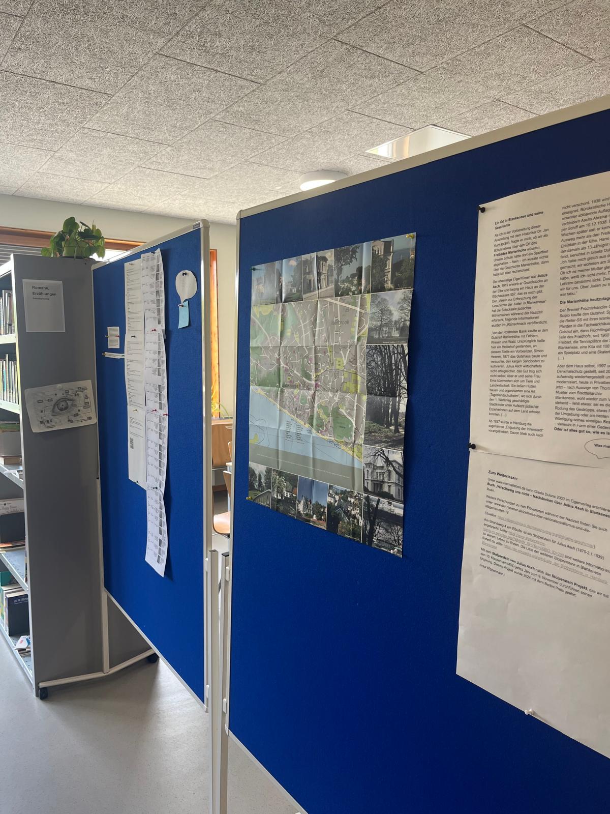 Die Ausstellung informiert auch zum täglichen Leben am Beispiel von drei Familien in der Bahnhofstraße in Blankenese. Geschildert wird, wie in der Zeit des Nationalsozialismus in ihr Leben eingegriffen und letztlich ihre Existenz vernichtet wurde. Ein Stadtplan, der die Lage der Stolpersteine und der Lager von Zwangsarbeiter:innen in Blankenese markiert, macht deutlich, was in Blankenese passierte. Hinweise auf die jeweiligen individuellen Schicksale sind bereitgestellt. Jede Schülerin, jeder Schüler der Schule soll sich fragen, dazu fordert eine Sprechblase auf, an welchen Stätten sie/er auf dem Schulweg vorbeikommt.