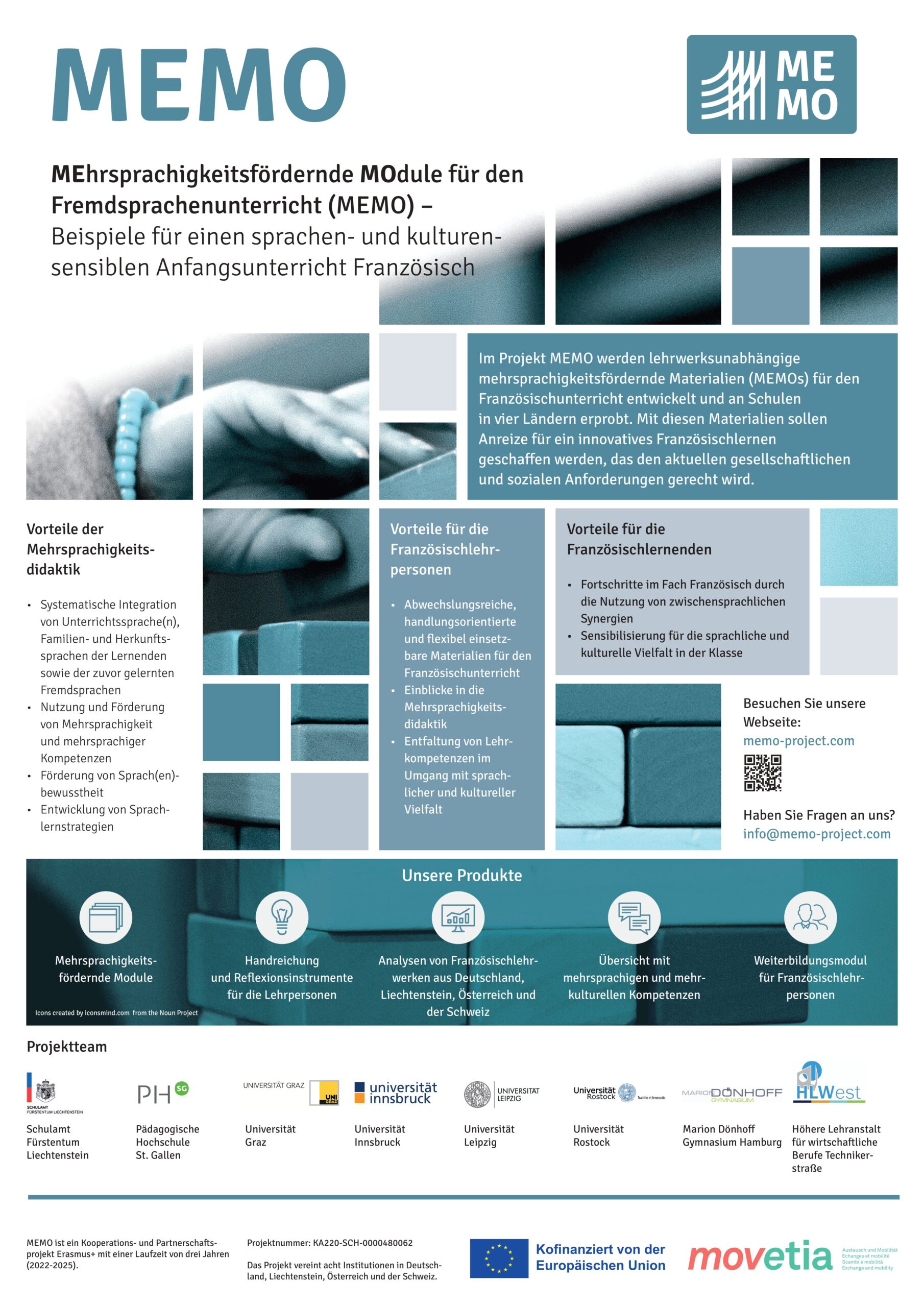 Das MDG hat als Partnerschule von 2022 bis 2025 an einem internationalen ErasmusPlus-Projekt teilgenommen, bei dem Schulen und Universitäten aus vier deutschsprachigen europäischen Ländern (Deutschland, Liechtenstein, Österreich, Schweiz) gemeinsam Materialien für den Anfangsunterricht Französisch entwickelt haben, die zum Ziel haben, die Vernetzung von Sprachen und Kulturen sowie die Sensibilisierung und Bewusstheit für sprachliche und kulturelle Phänomene in der Unterrichtspraxis zu fördern. In länderübergreifenden, multiprofessionellen Teams haben Lehrende und Forschende Lehrwerke analysiert, Konzepte entwickelt, Unterrichtsmaterialien erstellt, in ausgewählten Schulen erprobt (u.a. in Französischlerngruppen am MDG), Produkte auf Fachtagungen und Fortbildungen präsentiert und diskutiert und schließlich alle Ergebnisse im Januar 2025 auf einer abschließenden Projekttagung in Innsbruck vorgestellt. Alle Ergebnisse sind jetzt auf der Homepage des Projekts nachzulesen und stehen für den Einsatz im Unterricht als Downloads zur Verfügung (MEMO). Aktueller Flyer
