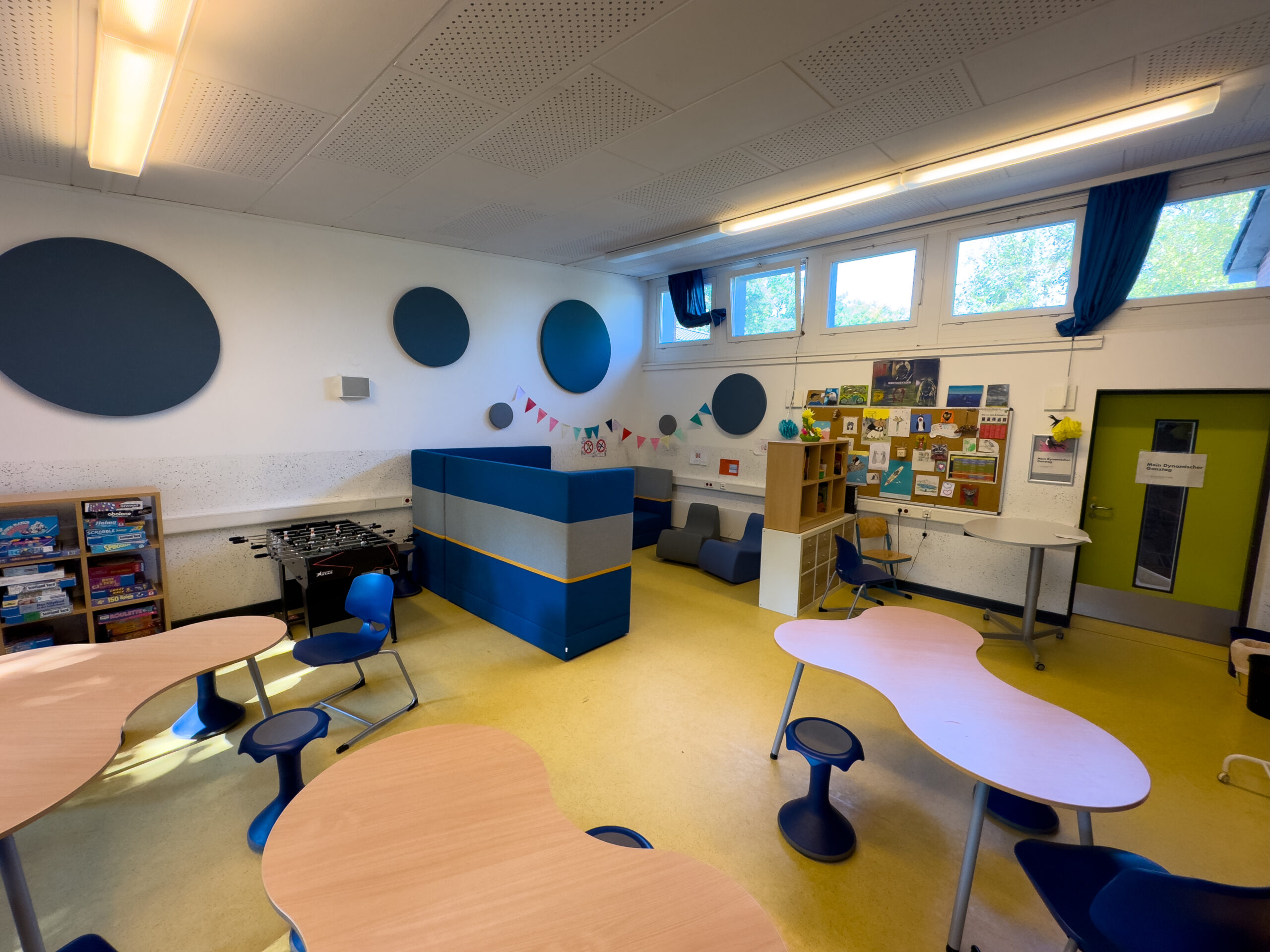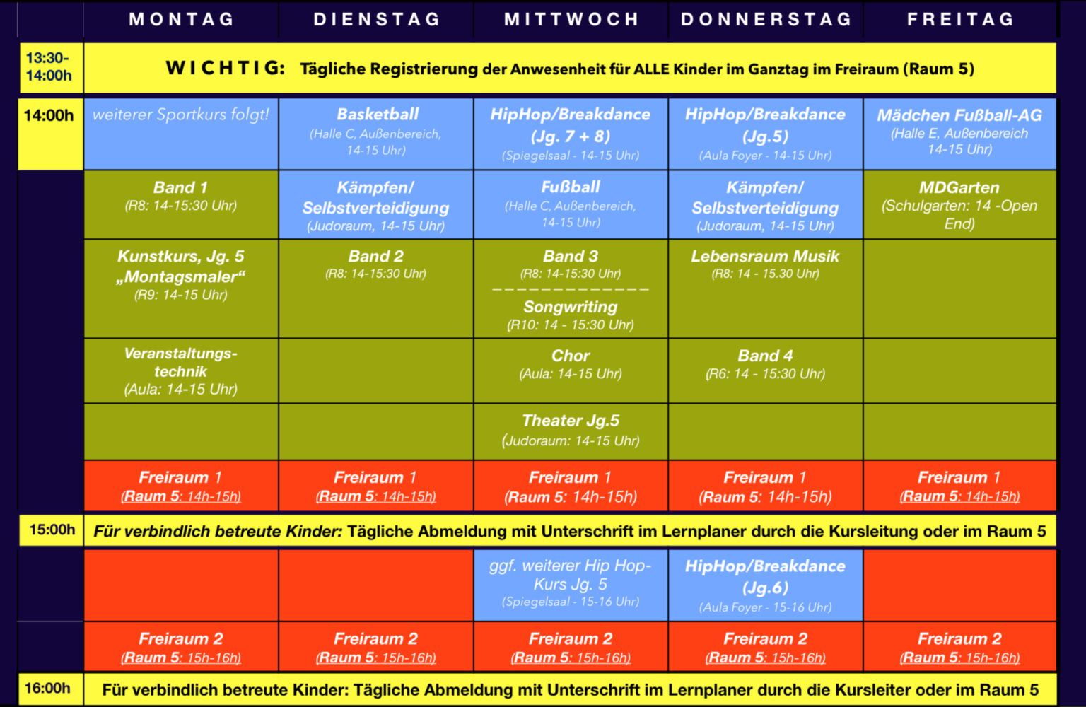Der Freiraum (Raum 5) ist gleichsam täglicher Anlaufpunkt für Schüler:innen, um ihre Anwesenheit/Teilnahme an den zu Beginn des Schuljahres gewählten Ganztagskursen registrieren zu lassen. So meldet sich jedes Kind, das eine Aktivität im Ganztag besucht, zwischen 13.30 und 14.00 Uhr im Freiraum an und geht anschließend in einen gewählten Kurs oder verbleibt im Freiraum.