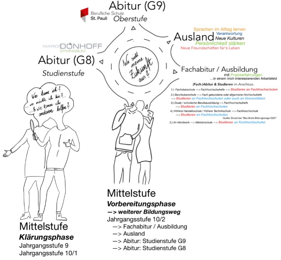 Der Jahrgang 10 bringt einen Kreisverkehr der Gedanken mit sich. Die Fragestellungen lauten: „Was sind meine Stärken? Wie sieht meine Zukunft aus? Was kann ich für meine Zukunft tun?“ Im Jahrgang 10 übernehmen die Schüler:innen die Verantwortung für sich und ihren eigenen Bildungsweg. Die Schüler:innen sollen aus dem Jahrgang 9 kommend die Vielfalt der Möglichkeiten an individuellen Bildungswegen kennenlernen, die sich je nach eigenen Interessen, Zukunftsvorstellungen und Stärken anbieten. Mögliche Wege nach dem Jahrgang 10 können Erfahrungen im Ausland sein, zunächst eine Ausbildung mit einem höheren Praxisbezug erfahren, dessen Weg dann zu diversen Berufsschulen bis zum Fachabitur führen können oder ein Weg zum Abitur in 3 Jahren, um mit mehr Ruhe dieses Ziel zu verfolgen. Die Möglichkeit des G9-Abiturs gibt es beispielsweise an dem mit uns kooperierenden Beruflichen Gymnasium St. Pauli. Ein Abitur in 2 Jahren (G8) ist natürlich auch bei uns am Marion Dönhoff Gymnasium möglich.