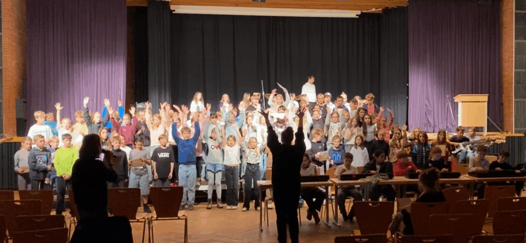 Tag der Musik der 5. Klassen Inmitten der Themenwoche „Gemeinsam Klasse sein“ der 5. Klassen erlebten alle Fünftlässler:innen eine ganz besondere Form des gemeinsamen Arbeitens. Am Tag der Musik, dem Mittwoch der Themenwoche, wurden sie zu Beginn der 3. Stunde in der Aula von der Band „Team Play“, unseren Profi-Musikern, mit einem phänomenalen Mini-Konzert empfangen. Danach ging es für alle gemeinsam ans Arbeiten: In nur einer Stunde sollte ein gemeinsamer Song aufführungsreif eingeprobt werden – in kleinen Gruppen von Sänger:innen, Tastenprofis, Gitarren- und Bassspieler:innen und Cajon-Expert:innen ging es in die Probenräume. Nach fleißigem Arbeiten standen in der 5. Stunde alle gemeinsam wieder auf der Bühne und präsentierten den Song „Zusammen“ vor einem erlesenen und begeisterten Publikum. Alle konnten den gemeinschaftsstiftenden Vibe der Musik live auf der Bühne erleben und hatten eine tolle Zeit.